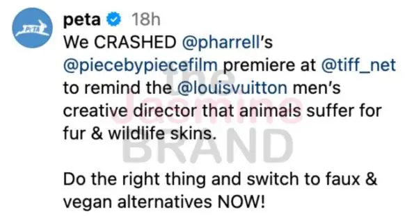 “We CRASHED Pharrell’s ‘Piece by Piece’ premiere at TIFF to remind the Louis Vuitton men’s creative director that animals suffer for fur & wildlife skins. Do the right thing and switch to faux & vegan alternatives NOW!”