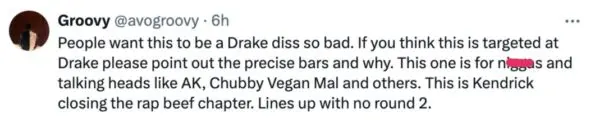 “People want this to be a Drake diss so bad. If you think this is targeted at Drake please point out the precise bars and why. This one is for n***** and talking heads like AK, Chubby Vegan Mal and others. This is Kendrick closing the rap beef chapter. Lines up with no round 2.”
