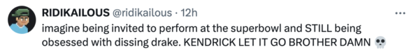 “Imagine being invited to perform at the Super Bowl and STILL being obsessed with dissing Drake. KENDRICK LET IT GO.”