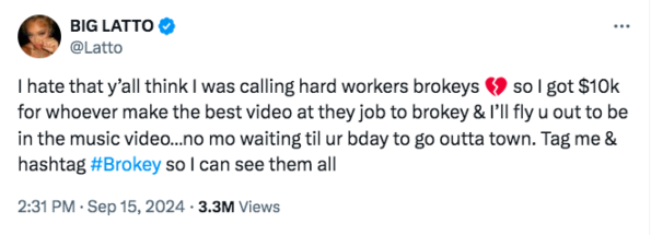“I hate that y’all think I was calling hard workers brokeys so I got $10k for whoever make the best video at they job to brokey & I’ll fly u out to be in the music video…no mo waiting til ur bday to go outta town. Tag me & hashtag #Brokey so I can see them all”