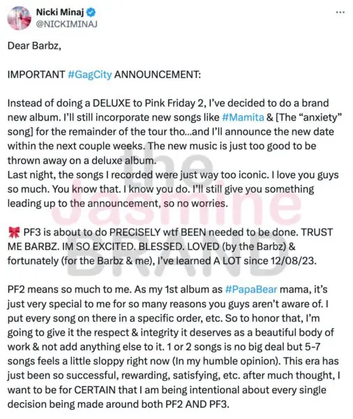 Nicki Minaj revealed her decision on X (formerly Twitter), explaining that the new album will be a continuation of her beloved Pink Friday series: