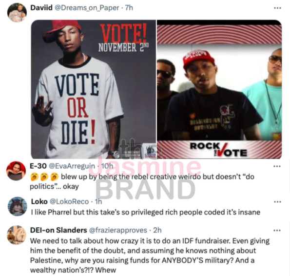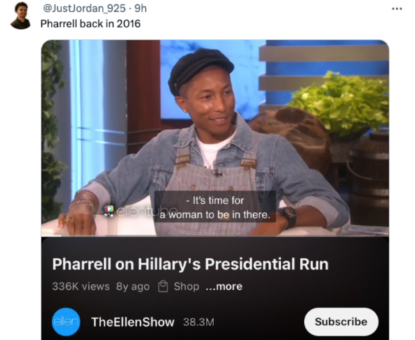 Other criticizers highlighted additional times when Pharrell involved himself in politics, pointing out his support for Hillary Clinton’s 2016 presidential run as well as his participation in Rock The Vote, an organization that promotes nationwide participation in elections.