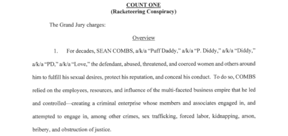 He’s also accused of “creating a criminal enterprise whose members and associates engaged in, and attempted to engage in, among other crimes, sex trafficking, forced labor, kidnapping, arson, bribery, and obstruction of justice.”