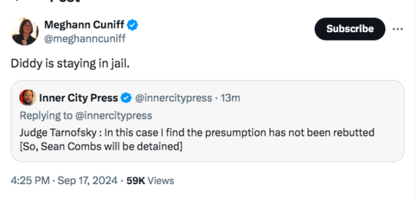 Diddy has pleaded not guilty to charges of racketeering conspiracy, sex trafficking by force, fraud or coercion, and transportation to engage in prostitution. Legal affairs journalist Meghann Cuniff noted on X that Diddy’s next hope at being released would be a ” bail review hearing before the Article III judge, U.S. District Judge Andrew L. Carter.”