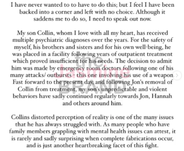 While it doesn’t appear that Kate has responded to her son’s latest allegations personally, this isn’t the first time Collin has come forward with stories of abuse against his mom. Back in July of last year, Kate publicly addressed the accusations after Collin criticized her parenting and accused her of wrongfully committing him to a mental institution as a child. Claiming that her son suffered from clinically diagnosed mental illnesses, Kate wrote: