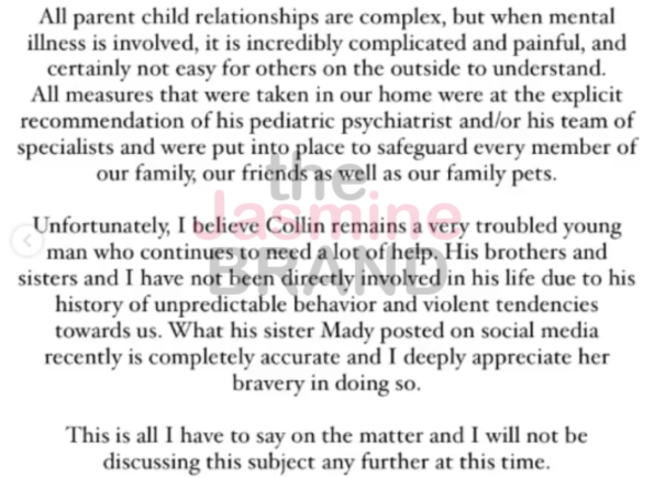 “All measures that were taken in our home were at the explicit recommendation of his pediatric psychiatrist and/or his team of specialists and were put into place to safeguard every member of our family, our friends as well as our family pets. Unfortunately, I believe Collin remains a very troubled young man who continues to need a lot of help. His brothers and sisters and I have not been directly involved in his life due to his history of unpredictable behavior and violent tendencies towards us.”