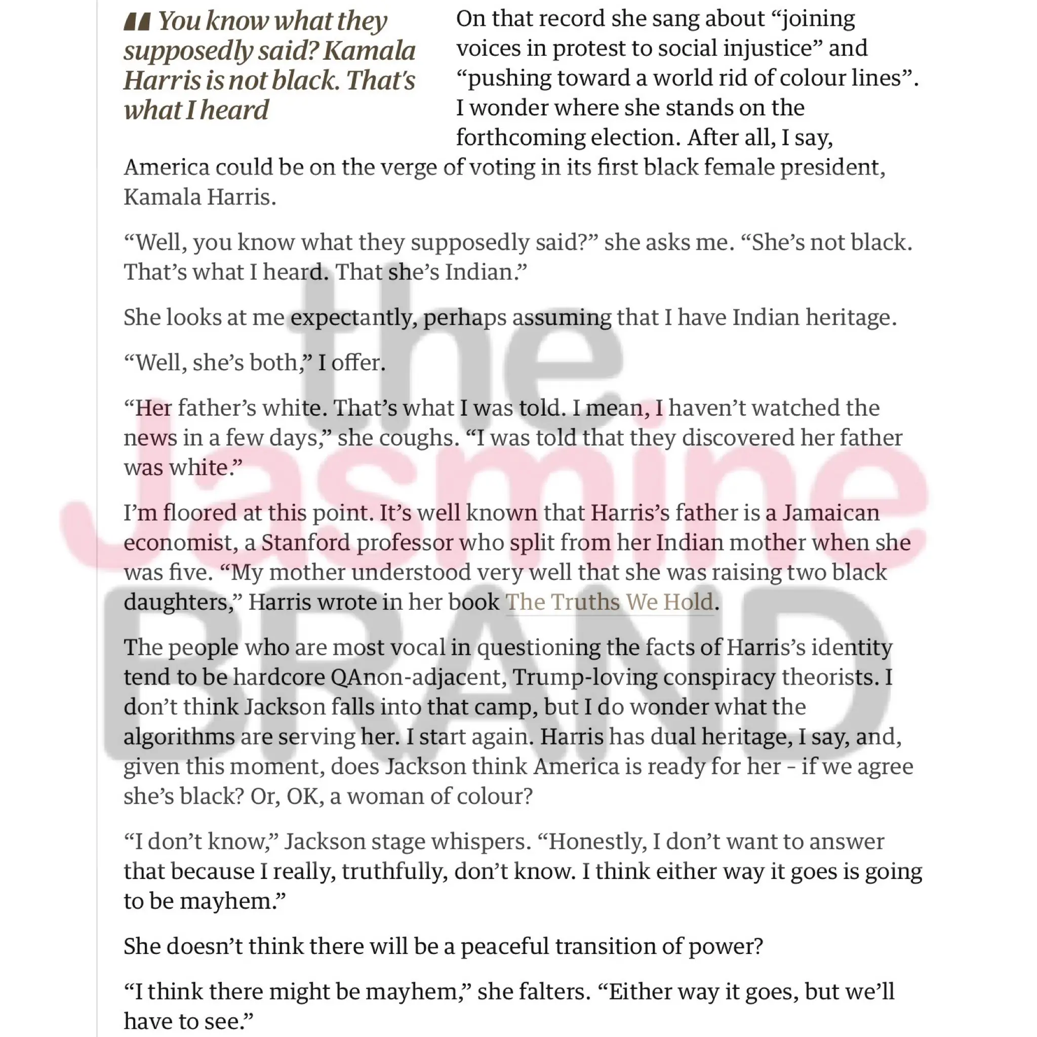 During an interview w/ The Guardian she was asked about Harris possibly becoming the first black woman president.