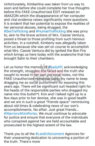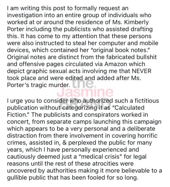 “I am writing this post to formally request an investigation into an entire group of individuals who worked at or around the residence of Ms. Kimberly Porter including the publicists who assisted drafting this.”