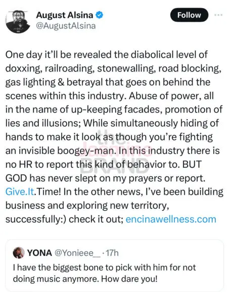 The 32-year-old singer recently took to X (formally Twitter) to address a fan who joked with him about “not doing music anymore.” As a response, August Alsina spoke on the “diabolical” aspects of the music industry while encouraging fans to check out his other business endeavors.