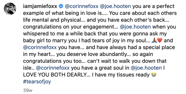 The wedding ceremony comes just eight months after Corinne Foxx announced her engagement to Joe Hooten. Jamie Foxx expressed his joy in a heartfelt Instagram post, praising the couple as a “perfect example of what being in love is.”
