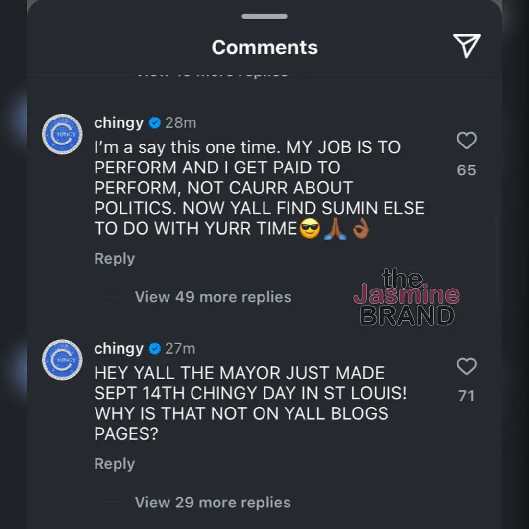 Original Story (Sept. 21, 2024): Chingy is unbothered by the folks criticizing his upcoming Donald Trump performance.
