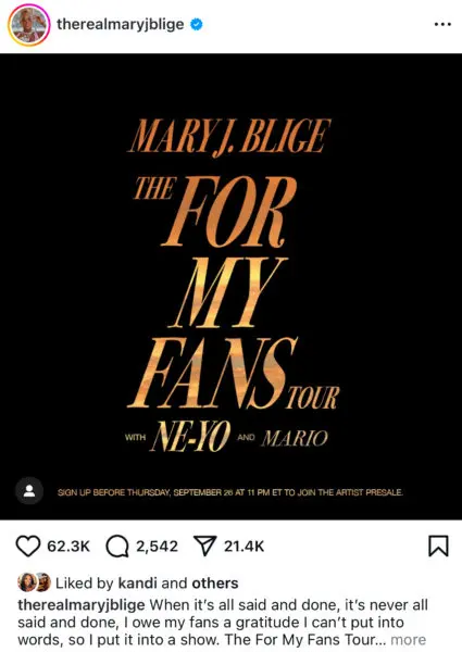 Fans of the iconic singer have something to look forward to as well. Blige announced her upcoming For My Fans Tour, featuring Ne-Yo and Mario, set to kick off in January 2025. Sharing her excitement on Instagram, she wrote,