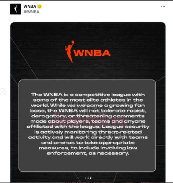“While we welcome a growing fan base, the WNBA will not tolerate racist, derogatory, or threatening comments made about players, teams and anyone affiliated with the league. League security is actively monitoring threat-related activity and will work directly with teams and arenas to take appropriate measures, to include involving law enforcement, as necessary.”