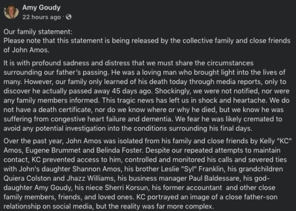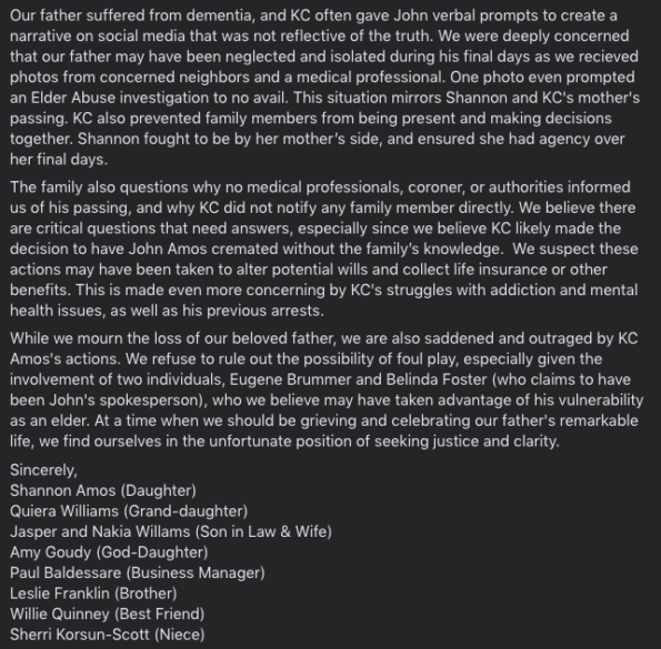 “The family also questions why no medical professionals, coroner, or authorities informed us of his passing, and why KC did not notify any family member directly. We believe there are critical questions that need answers, especially since we believe KC likely made the decision to have John Amos cremated without the family’s knowledge.”