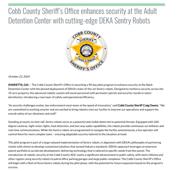 The Cobb County Sheriff’s Office unveiled its new 6-foot-tall DEKA Sentry Robots on Wednesday (October 23rd), insisting that devices will allow them to shift personnel elsewhere to increase productivity and have a safer facility for officers.
