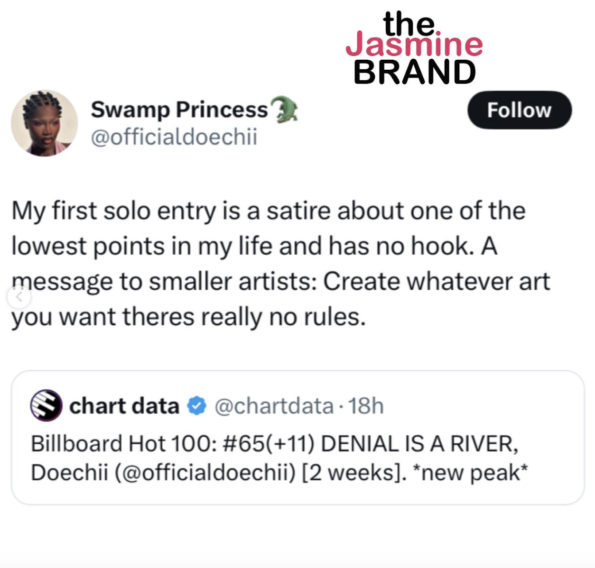 “Denial is a River” has reached number 65. Doechii says the record was birthed from a low point in her life and wasn’t the most polished track of hers. She says this should be a motivation for other artists to release their art.