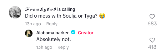 However, according to Alabama, Bhabie’s bars are all lies. When asked if the allegations are true by a fan in her TikTok comments, Alabama said,