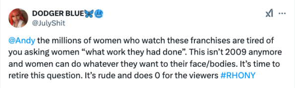 “This isn’t 2009 anymore and women can do whatever they want to their face/bodies. It’s time to retire this question. It’s rude and does 0 for the viewers #RHONY”