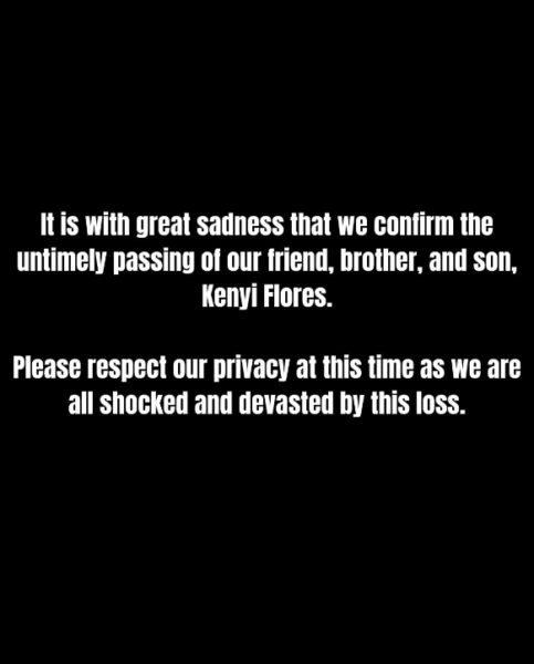 “It is with great sadness that we confirm the untimely passing of our friend, brother, and son, Kenyi Flores. Please respect our privacy at this time as we are all shocked and devasted by this loss.”