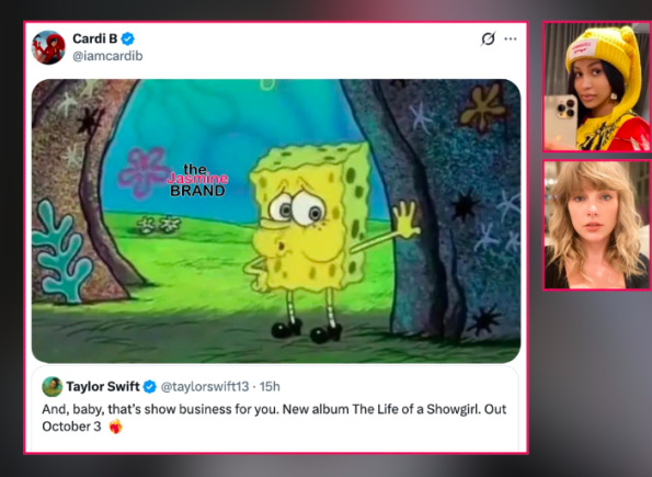 The rapper shared a meme of SpongeBob letting out a sigh of relief and a clip of Regina Hall from Scary Movie jumping up and down in celebration after learning Taylor’s Life of a Showgirl album will drop on October 3rd. Cardi’s new project, Am I the Drama?, is set to release September 19th.