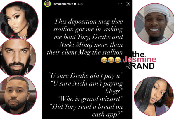 Akademiks made light of the questioning, which is a part of Meg’s ongoing case against Tory. If you recall, she has continuously accused him of paying bloggers and others to slander her name.