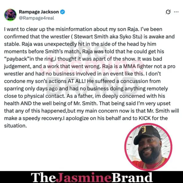 Rampage also revealed that Raja had suffered a concussion just days earlier, making his involvement in any physical altercation “irresponsible.” He ended his statement with an apology “on his behalf and to KICK for the situation,” stressing concern for both his son’s condition and Syko Stu’s recovery.