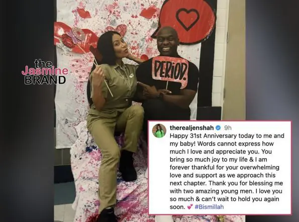 On Instagram, Jen shared a photo of herself and her husband holding up signs that read “xoxo” and “period” from jail. Her caption reads, “Happy 31st Anniversary today to me and my baby! Words cannot express how much I love and appreciate you. You bring so much joy to my life & I am forever thankful for your overwhelming love and support as we approach this next chapter. Thank you for blessing me with two amazing young men. I love you so much & can’t wait to hold you again soon. #Bismillah”