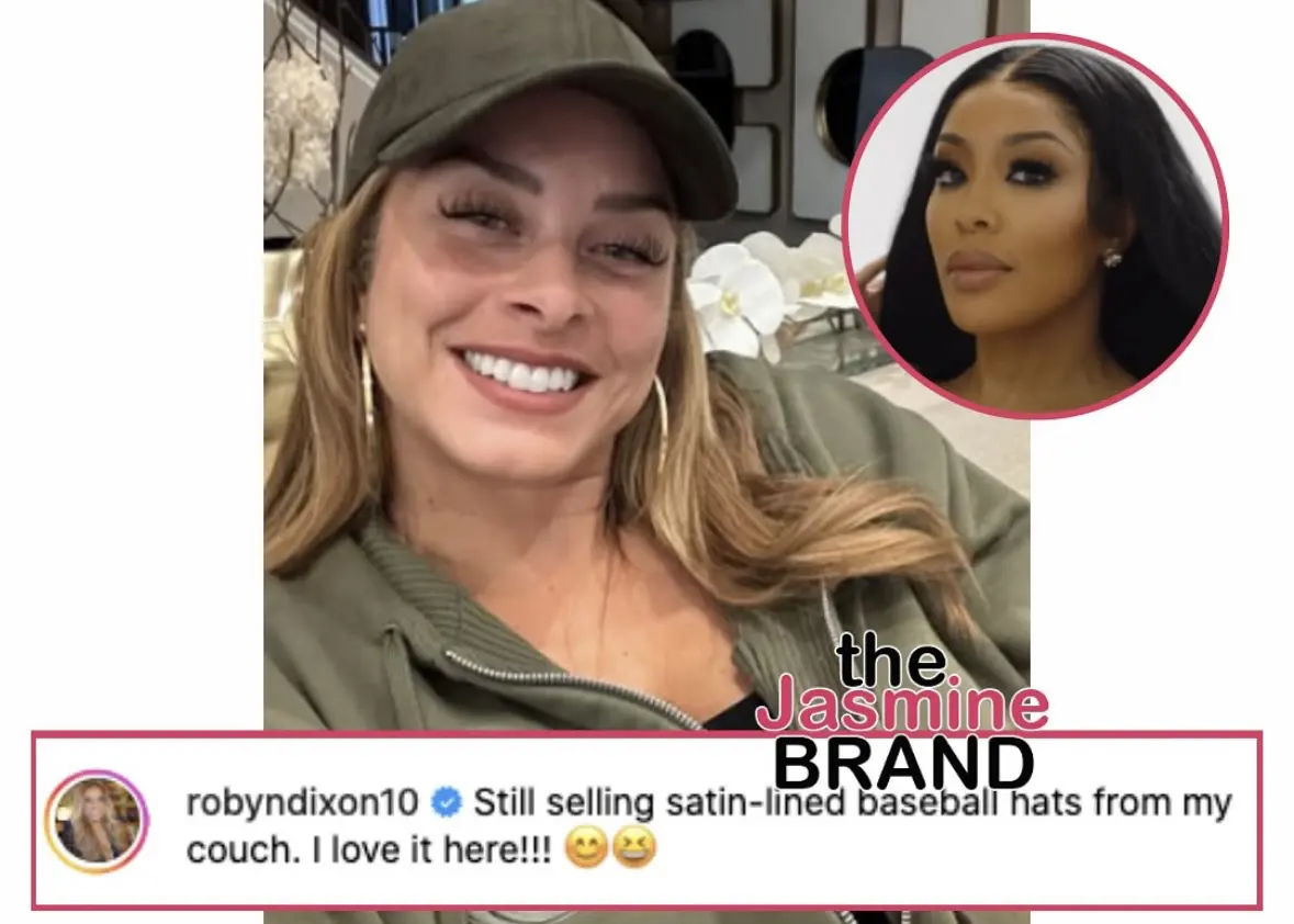 Appearing to respond to #KMichelle’s remarks about her employment status after reportedly being let go from #RHOP following Season 8, Robyn shared a smiling selfie from her sofa with the caption: “Still selling satin-lined baseball hats from my couch. I love it here!!!