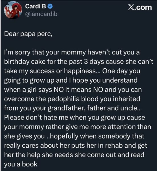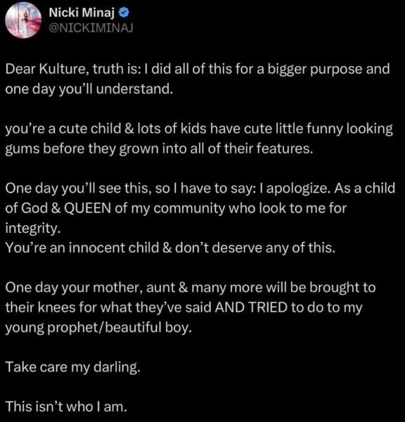 Nicki Minaj Writes Open Letter To Kulture & Cardi B Writes Open Letter To Papa Bear October 3, 2025 by TJB Writer in Music Nicki Minaj Writes Open Letter To Kulture & Cardi B Writes Open Letter To Papa Bear Last night, Nicki Minaj & Cardi B wrote open letters – Nicki penned one to Cardi’s daughter Kulture. Cardi penned one to Nicki’s son Papa Bear ? Facebook Twitter LinkedinGoogle Tweet Like Plus Pin It Share Authored by: TJB Writer Previous ArticleNext Article Related Posts Boosie Has ‘Tears Of Joy’ After Test Results Show He’s Cancer Free: God Is Great DaBaby, MoneyBagg Yo & Blac Youngsta To Hold 4th Of July Concert Amidst COVID-19 Pandemic August Alsina Explains Why He Went Public With Jada Pinkett-Smith Relationship: People Looked At Me Like This Problematic Guy, Who Was Reckless Pushing Up On Someone’s Wife Bow Wow Threatens To Call Out People Who Allegedly Owe Him Money: ‘Ima Start Naming U N*ggas’ Aaliyah’s Estate Releases Statement Against ‘Unauthorized Projects’ As Her Previous Label Hints At Music Release Shakira Could Face More Than Eight Years in Prison for Tax Fraud in Spain GloRilla Says She’s ‘Single & Celibate’ Until God Sends Her Husband Queen Latifah Becomes The First Female Rapper Added To The National Registry Of Music Along w/ Madonna, Mariah Carey & Daddy Yankee