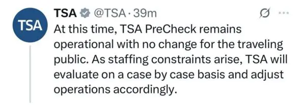 TSA added that if staffing constraints arise, it will evaluate operations on a case-by-case basis and make adjustments as needed. At this time, though, standard checkpoint procedures — including PreCheck lanes — remain unchanged.