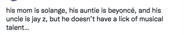 Beyoncé’s husband (Julez’s uncle-in-law) Jay-Z is regarded as one of the greatest rappers in history. And their daughter Blue Ivy – Julez’s cousin if you’re keeping up – won a Grammy last year at only 9-years-old.