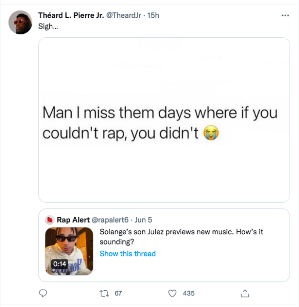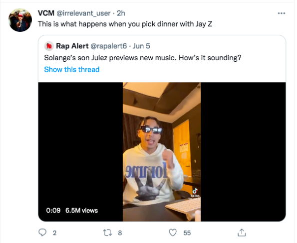 Daniel “Julez” Smith Jr., son of singer Solange Knowles, shared a snippet of his music for fans to hear on TikTok over the weekend. In a 15-second clip, the 17-year-old appears to be sitting in a studio where he raps along to a recorded track.