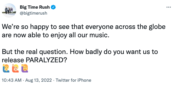 “We’re so happy to see that everyone across the globe are now able to enjoy all our music. But the real question. How badly do you want us to release PARALYZED?”